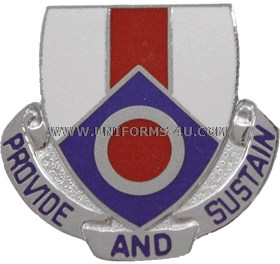 Chevrons have long been used in heraldry to denote support, and the chevron-shaped device here symbolizes the Support mission of the unit, its blue coloring alluding to its service in the Pacific Theater during World War II. “Provide And Sustain,” the unit motto, sums up the basic mission of the organization.
