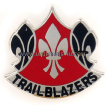 A battle-axe head is the basis of the insignia; the idea of an axe head is suggested by the Shoulder Sleeve approved for the 70th Infantry Division, which uses a traditional wood-axe head to symbolize pioneering settler clearing paths through dense foliage of the unit’s home area in Oregon. Here, the head of a battle-axe was chosen in honor of the unit’s first participation in Combat. A trio of fleur-de-lis represents three campaigns in Europe during World War II. “Trailblazers” is the unit nickname, again inspired by the rugged Oregon landscape; it also connotes the type of leadership necessary to serve effectively as a training organization.