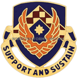 The U.S. Army Aviation Logistics Distinctive Unit Insignia (DUI), or unit crest, was approved on 22 March 1985. It is composed of two distinct elements: a gold, arched scroll with the School motto “Support And Sustain” inscribed in the Army Aviation branch color of ultramarine blue, and a shield with a background also in ultramarine blue featuring a pair of spread wings in golden orange—secondary branch color of the Aviation Corps—surmounted over a checkered chevron and enwrapping a golden compass rose.